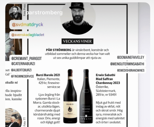 2021 Barolo från vår vinmakare Burzi i La Morra har blivit utsett till ett av veckans viner i Svenska Dagbladets helgbilaga, med detta fina omdöme av den kända vinskribenten Pär Strömberg:
