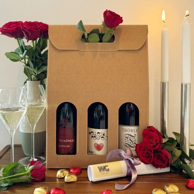 Alla hjärtans dags-lådan består av tre viner som levereras i en fin kartong tillsammans med recepten till de specialkomponerade maträtterna från Wrangensten Gastronomi.