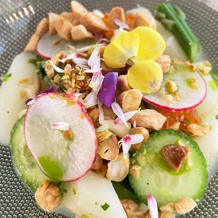 Vit och grön sparriscocktail med löjrom, citrus, marconamandel och ätliga blommor