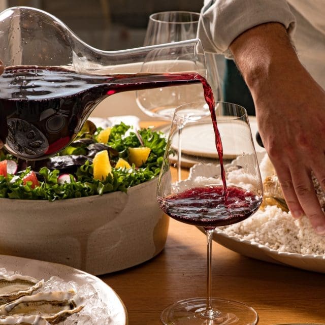 För att kunna erbjuda den bästa helhetsupplevelsen när det gäller vin samarbetar vi med glastillverkaren Grassl Glass, som har två varianter av karaffer i sitt sortiment just för att ge olika viner bästa förutsättningar vid dekanteringen. Vigneron Decanter har en mer klassisk vidare form som passar till yngre viner, och Elemental Carafe har den mer avlånga formen som passar till äldre viner.